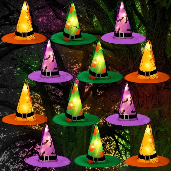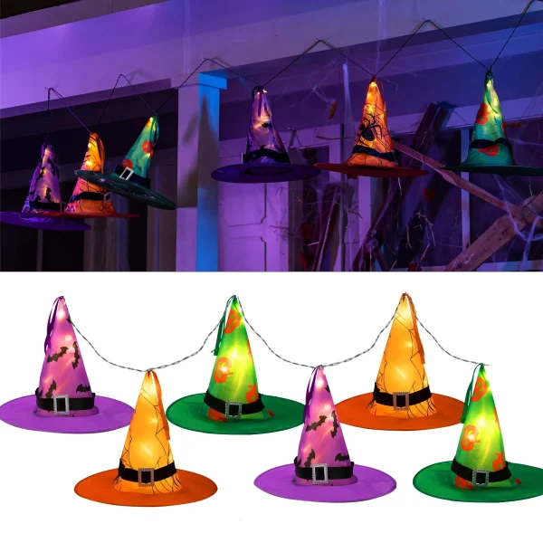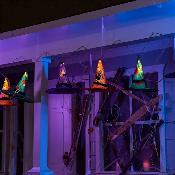 - This Halloween decorations multi-color led lights features each witch hat that has 10 separate led lights, 8 different modes, totaling 120 led lights. Halloween decoration will give you a festive and spooky atmosphere to enjoy Halloween night. Battery operated – easily turns Halloween decorations on and off. It works with batteries (not included). Suitable for indoor and outdoor use.