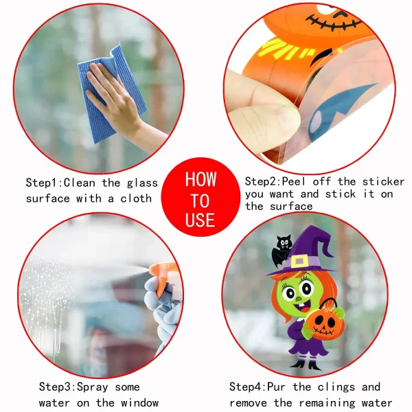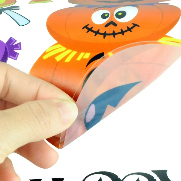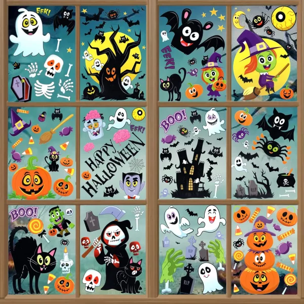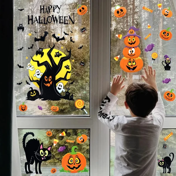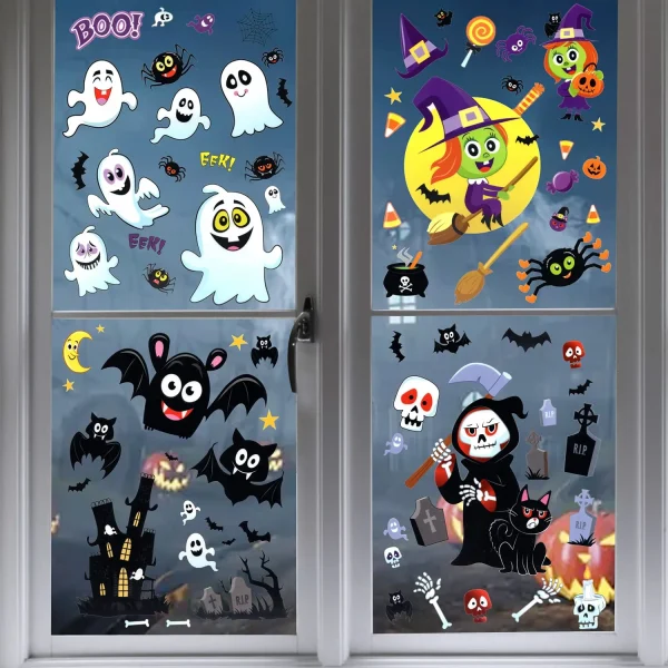 - Our party favor includes 8 sheet Halloween window clings 158 pcs total. These have super cute Halloween-themed designs like ghosts, pumpkins, cats, eyeballs, etc.