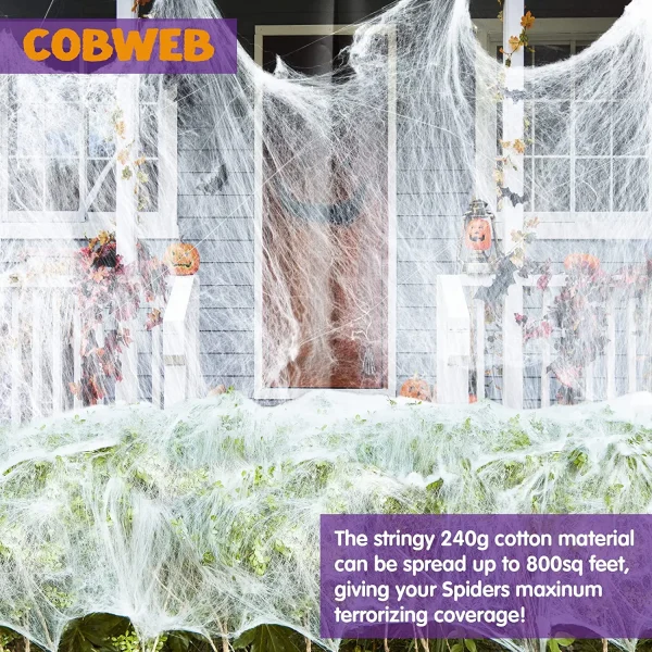- AWESOME HALLOWEEN DECOR. Our Halloween Cobwebbs Outdoor includes Cotton that can stretch to an 800sqft spider web with 2 realistic spiders (one 120cm/47in; one 90cm/35in)
