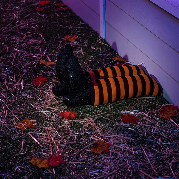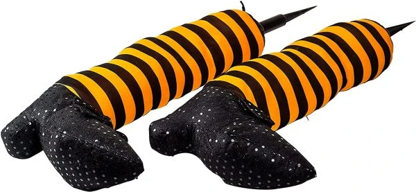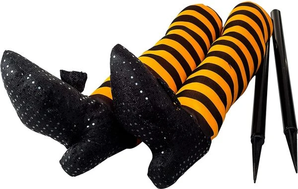 - Our decoration includes 2 pieces of wicked witch legs with detachable stakes in red shoes and black and white stripe socks. A PE bag is also included.