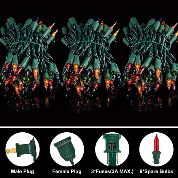 • Green wire string lights include 3 sets of colorful incandescent Christmas lights with 150 lights. Each set is 38.7 feet in length with 3-inch spacing. Conventional household power supply ac 120 volts 61.2 watts. 4 sets can be connected end to end. Comes with 9 extra bulbs and 3 fuses.