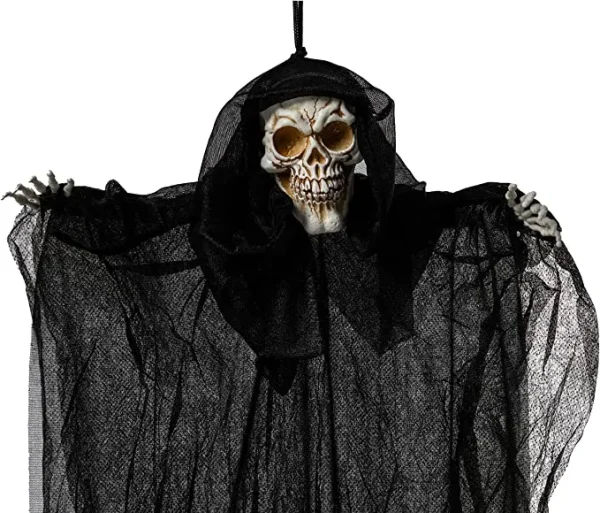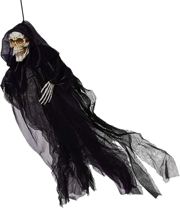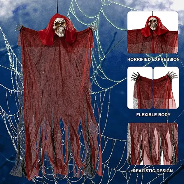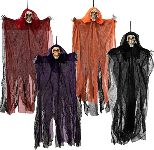 - Our hanging decoration includes 4 skeletons in green, red, purple, and black. The size of each skeleton is 26 inches.