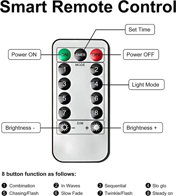 • The string lights could change the lighting modes (Combination, In waves, Sequential, Slow Glow, Chasing/Flash, Slow fade, Twinkle/Flash, Steady on) by hitting the button in the battery box.