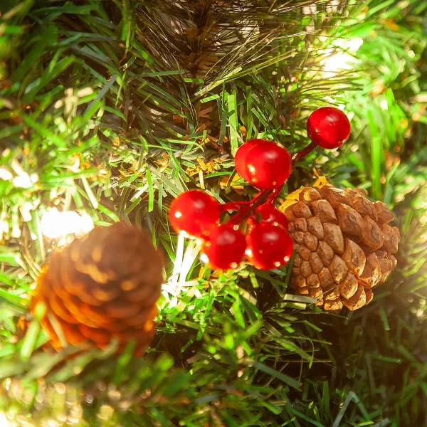 With pine cones and red berries ornaments, this Christmas garland prelit looks natural and beautiful. The pine cones are made from plastic and painted with lacquer paint to make them look more realistic. The red berries are made from brown silk leaves that have been glued together to form a ball shape. The nuts are also made from silk leaves but they are left flat on two sides so they can be glued together to create a triangular shape. This gives them the appearance of having been cut off of a tree branch rather than being individually crafted pieces like all the other decorations on this garland.