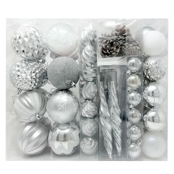 • Our White And Silver Christmas Ornaments include 14 pinecones, 4 gift boxes, 12 icicles, 8 glitter balls, 9 shiny balls, 15 matte balls, 4 rhombic balls, 12 wavy balls, 2 striped balls, 5 shiny balls with merry Christmas pattern, 2 transparent balls with foil. Measuring 1.57’’, 2.36’’, 3.15 inches. Each Color Is Bright And Beautiful And Perfect For Christmas Indoor And Outdoor Decorations!