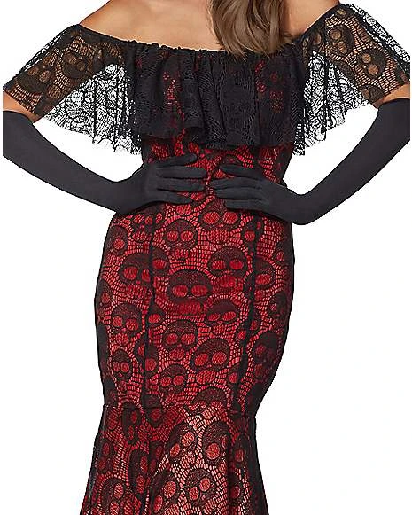 It’s time to celebrate with this festive Day of the Dead dress costume. Its beautifully put-together red and black design will have you dancing the night away!