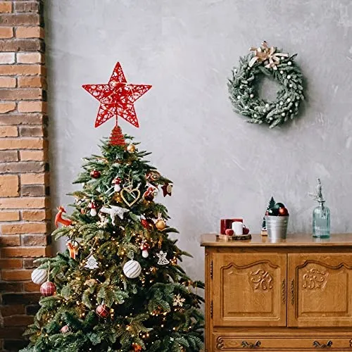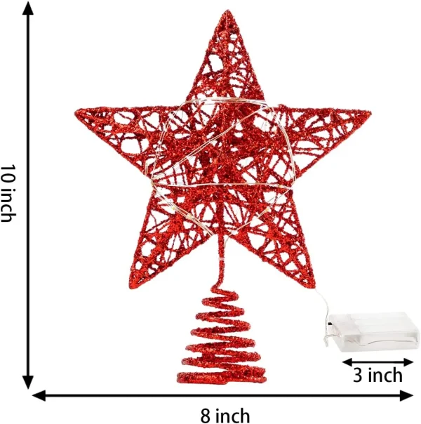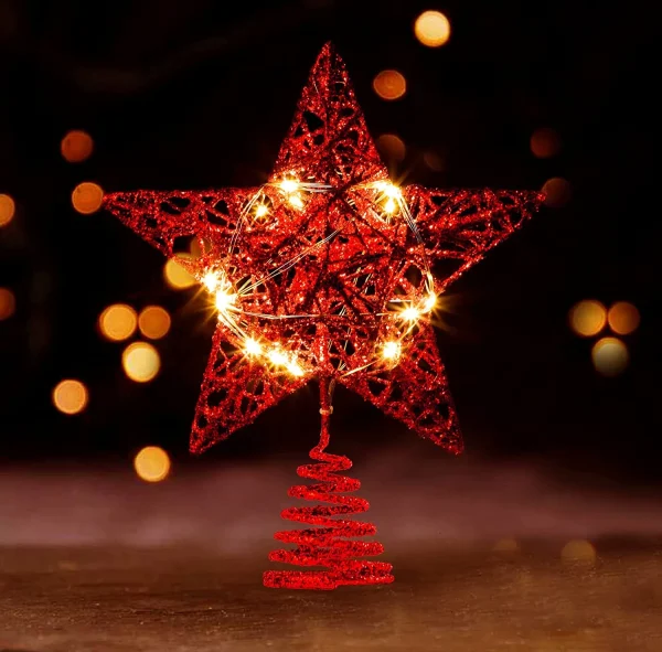 • This Star Tree Topper is perfectly coated in Red with a shining glitter around it. When the built-in Warm White LED is lit, its glittery coat does shine brightly along with the lights.