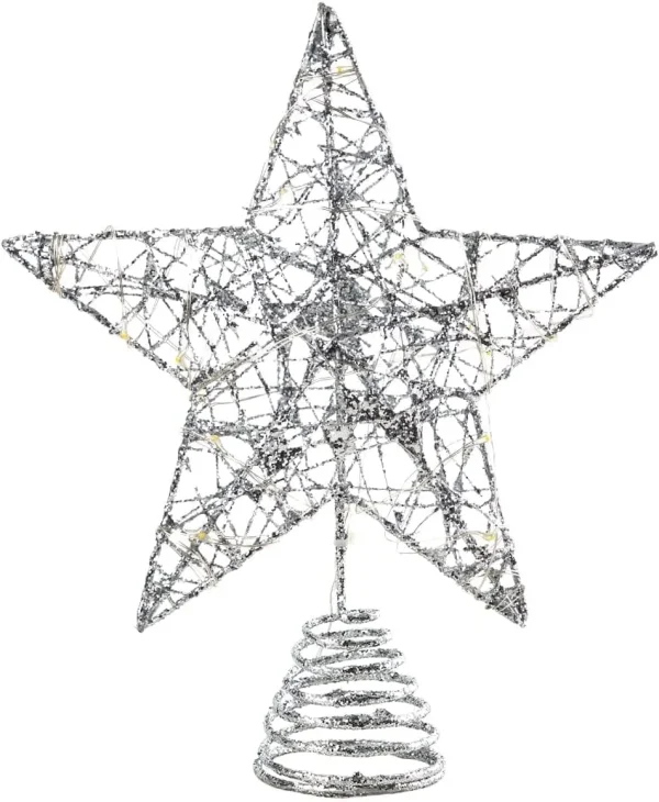 • This Star Tree Topper is perfectly coated in Silver with shining glitter around it. When the built-in Warm White LED is lit, its glittery coat does shine brightly along with the lights.