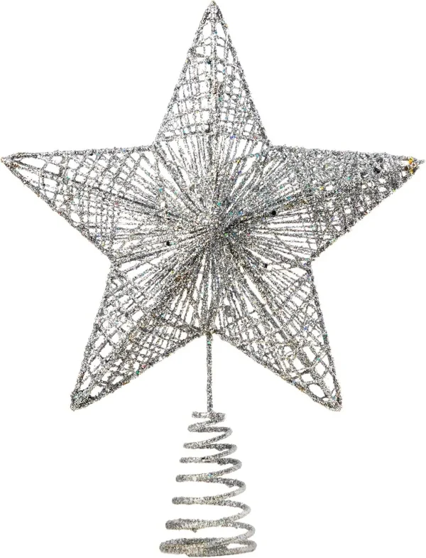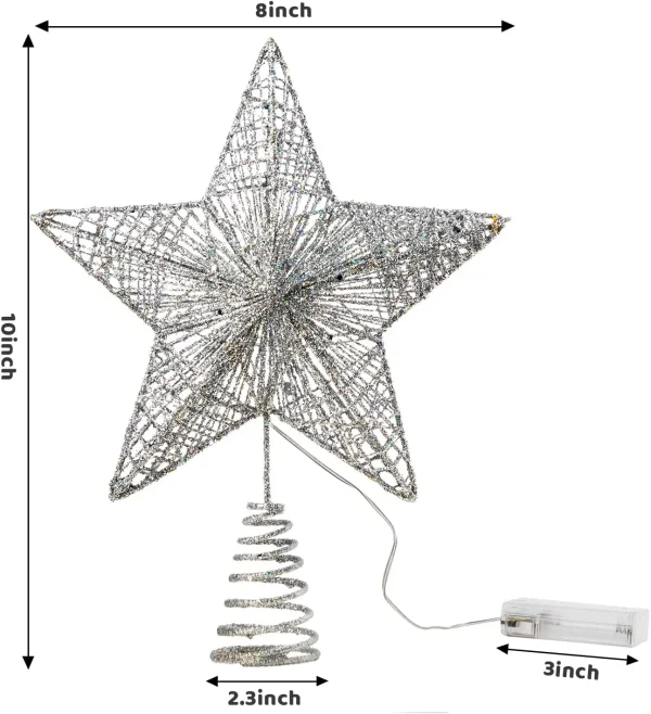 • This Star Tree Topper is perfectly coated in Silver with shining glitter around it. When the built-in White LED is lit, its glittery coat does shine brightly along with the lights.