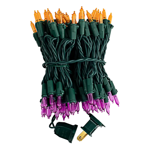 • Purple and Orange LED String Lights to include A Set of 100 Count of Always On Holiday purple and orange LED Green Wire String Lights. Each set is Lighted 26.25 feet in length and 100 count super bright PURPLE ORANGE LEDs.