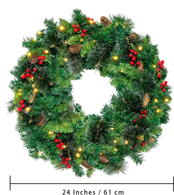 • Pre lit artificial Christmas wreaths include 160 branch tips, 12 Red Berries, 12 Pine Cones & Silver Glitter Pine Needles. Our wreath set even comes with a 15” black door hanger to make the setup easier! It’s time to add charm to your place with this realistic wreath for the wonderful winter and Christmas.